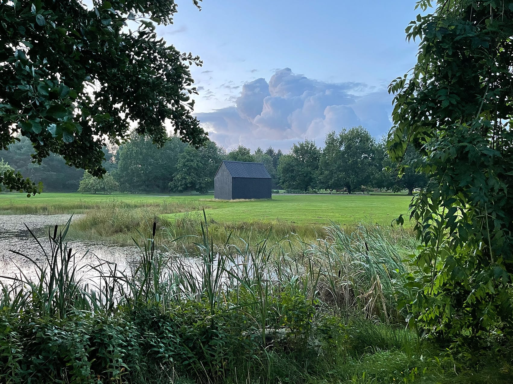 Field Observatory is a temporary public art work situated by the pond of Hanhipuisto at the Kirjurinluoto park in Pori, Finland. The site serves as a gathering place where visitors can slow down to observe happenings of the growing season through the processes of the soil. While modelled by the artist from the starting point of a traditional barn, the measurements of the minimalist, dark-toned pavilion features elements reminiscent of a temple or a room of silence.