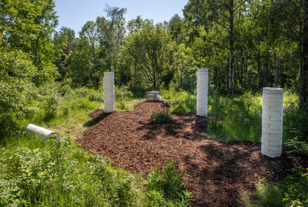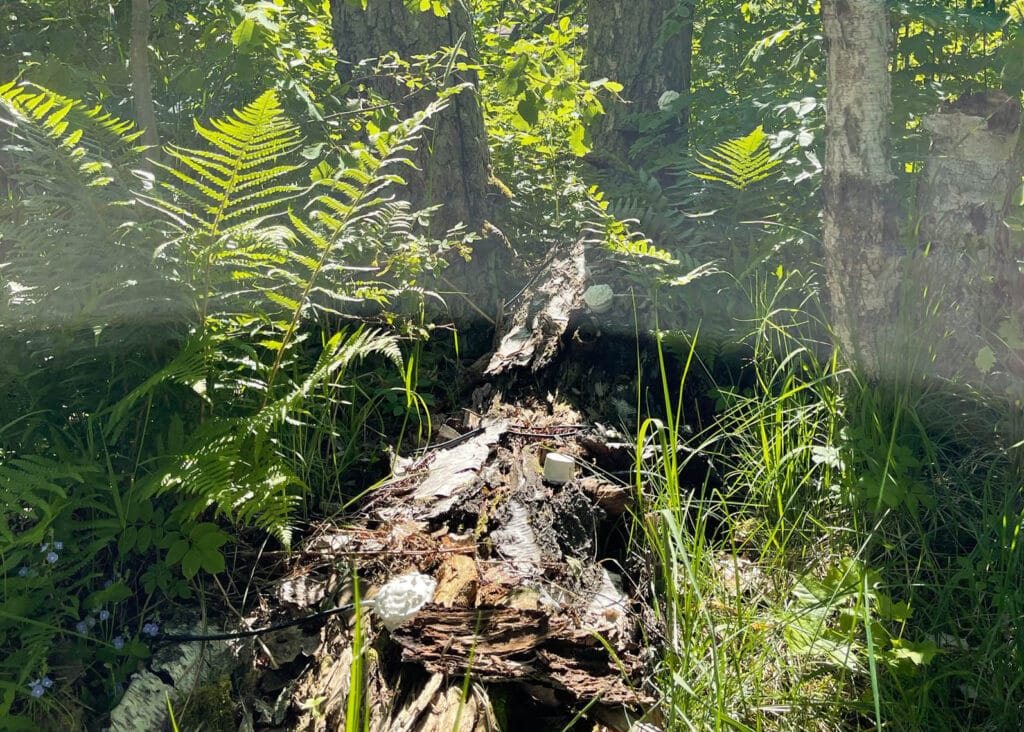Teemu Lehmusruusu’s hybrid artwork House of Polypores integrates natural processes and biomaterials research with site-sensitive sonic sculpture. Through self-built sensors, it taps into the nearby decaying trees and converts their vibrations into a resonating sonic experience that porously fuses with the environmental sounds. The installation combines mycotecture – a structure made of mushrooms and an organic growth medium – with custom-made electronics and naturally decaying wood. The work is powered by solar energy, transforming it into a standalone system to speculatively communicate with the multispecies environment largely beyond human sensory perception.