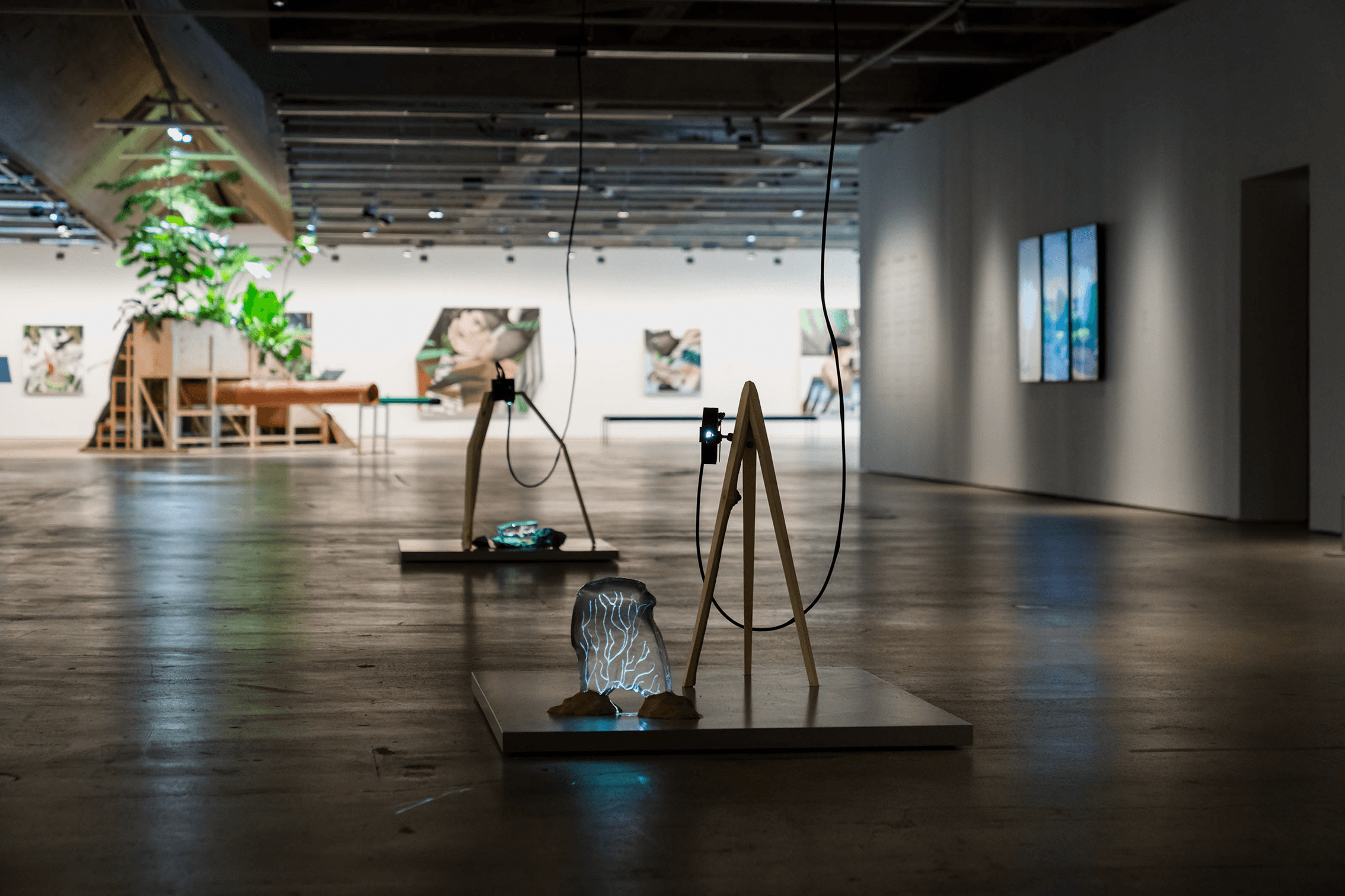 Teemu Lehmusruusu uses his work to study the conditions necessary for the existence of ecosystems and food chains. In the installation Parent Matter, 3D-animations of soil generation are combined with natural materials formed by humans and geological forces. The work examines the invisible world of our planet’s soil, which enables life on Earth. Using artistic methods, Lehmusruusu makes visible that which usually remains hidden to our senses, such as the capacity of mycelia to effect change, the breathing of plants and the subtle processes of soil.