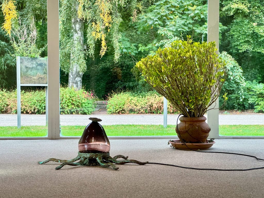 Pulse is a sonically resonating bronze and glass sculpture, a human-to-soil probe connecting to its chosen environment’s ecosystemic agencies and prerequisites of bioactivity with the help of moisture and temperature sensors. The sound sculpture taps into the pulse on the Earth’s skin, the thin organic layer covering our stony planet. In its ethos, the sculpture creates a site of attention to those fragile conditions of life that lie below our feet, and that we classically do not understand to be part of the idea of ‘landscape’. Landscape is understood here as volumes instead of surfaces, and sculpture as a possibility to open routes, places to stop and ways of bodily encounter the dynamism of these volumes as a materially resonating, aesthetic experience. The sculpture was moved around the Amstelpark and exhibited inside the Glass Pavilion, connected to a resident plant from the nearby Orangerie.